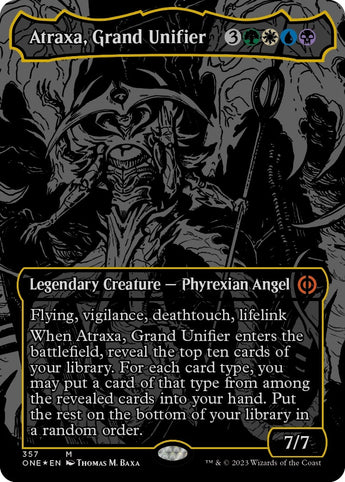 When Atraxa, Grand Unifier enters the battlefield, reveal the top ten cards of your library. For each card type, you may put a card of that type from among the revealed cards into your hand. Put the rest at the bottom of your library in a random order. |