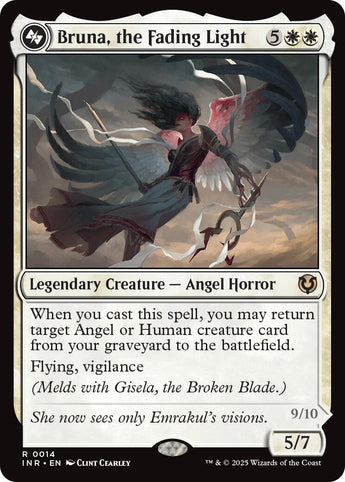 Flying, vigilance (Melds with Gisela, the Broken Blade.) ------------- Meld Partner: Gisela, the Broken Blade When Melded, it becomes the following: Brisela, Voice of Nightmares Legendary Creature — Eldrazi Angel Flying, first strike, vigilance, lifelink Your opponents can't cast spells with mana value 3 or less. 9/10 |