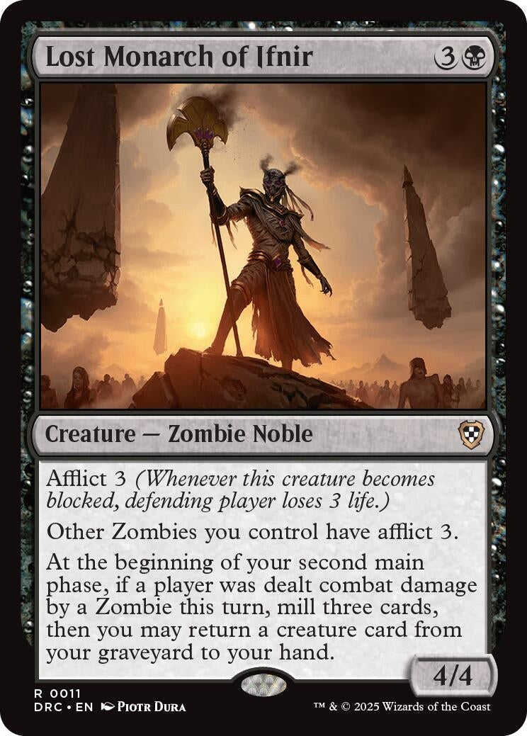Other Zombies you control have afflict 3. At the beginning of your second main phase, if a player was dealt combat damage by a Zombie this turn, mill three cards, then you may return a creature card from your graveyard to your hand. |