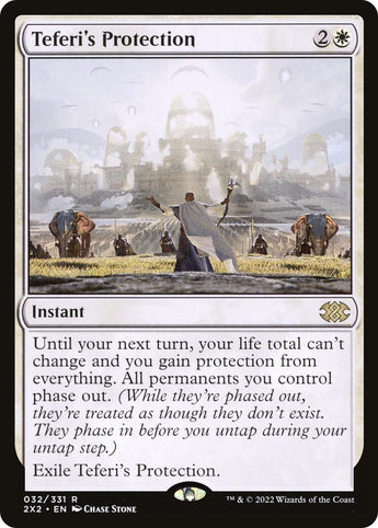 | Rules Text Contains: | Until your next turn, your life total can't change and you gain protection from everything. All permanents you control phase out. (While they're phased out, they're treated as though they don't exist. They phase in before you untap during your untap step.)